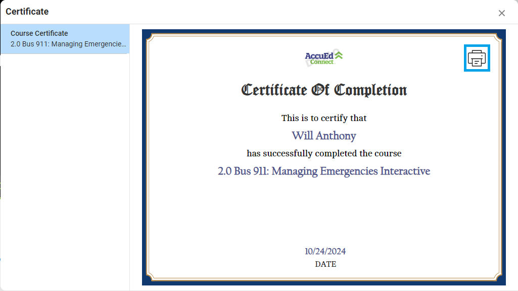 - A Certificate should appear with the User's name, the Course they completed, and the date the Course was completed.