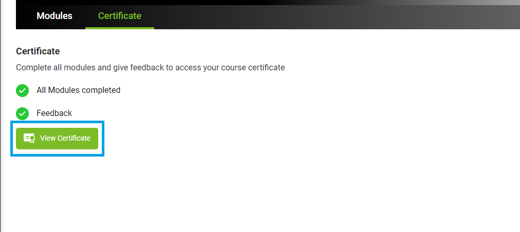 5. Once inside the selected the Course, click on the Certificate Tab and make sure you have completed the Feedback response.