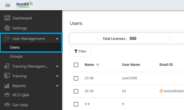 2.Find the User Management tab on the left-hand side of the screen and click it. Click the Users Dropdown.