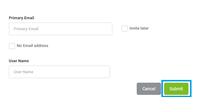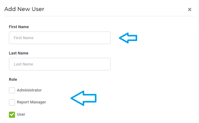 A form will appear on the right, fill it out with the necessary information. First and Last name, Role (Administrator, Report Manager, or User), and an email address or Username.